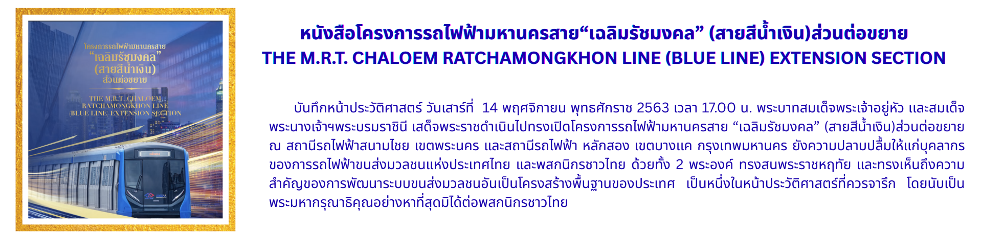 หนังสือที่ระลึก โครงการรถไฟฟ้ามหานคร สายเฉลิมรัชมงคล (ส่วนต่อขยาย) ปี 2563 : THE M.R.T. CHALOEM RATCHAMONGKHON LINE (BLUE LINE) EXTENSION SECTION